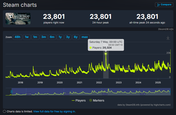 With the time ticking down to the sequel, the number of concurrent players for the first game saw a sharp spike on Steam, reaching an all-time peak of 23,801 concurrent players. This beats its former record of 20,324 concurrent players from 3.3 years ago.