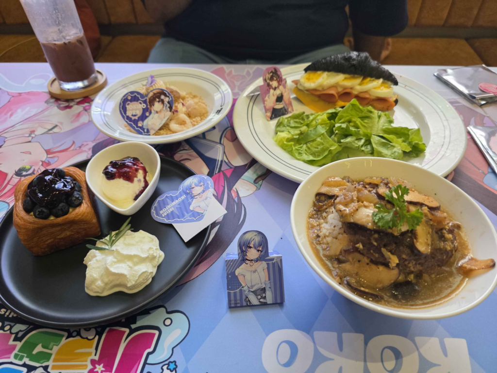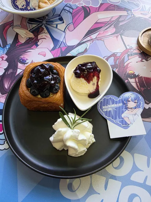 During our visit, we tried out Suisei’s Mushroom Onion Hambury and Robocosan’s Black Ham Croissant, with Suisei’s Blueberry and Cream Cheese Danish and Sora’s Tropical Citrus Cream Puff for dessert, accompanied by AZKi’s Lava Dark Chocolate as our drink of choice. Each dish was beautifully presented, and tasted on par with anything you’d find in a café of a similar price range.