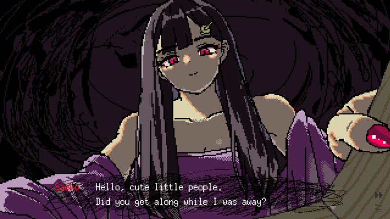 Our cold, dark days are almost in cruel juxtaposition to the beautiful nights that you spend in Saeko’s company. The night phase features stunning pixel animation and soothing lo-fi tunes, which does nothing to subdue the creeping sense of dread as you try to hold a conversation with a woman who could crush you under her finger. The gameplay also pivots away from the typical visual novel format into real-time choices, where one misplaced remark could lead to your bloody demise.