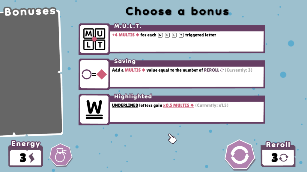 Much like actual Scrabble, the main gameplay of Wordatro involves building words using a limited pool of letters, with each letter carrying a unique point value. What makes it different is the addition of bonuses, which you can equip from a random selection between rounds. From score multipliers to increased drop rates for special tiles, each run is going to be a completely different experience.