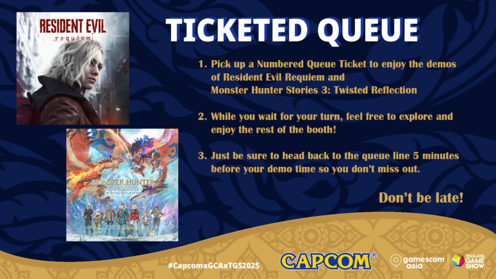 To ensure a smooth on-site experience for all visitors, Resident Evil Requiem and Monster Hunter Stories 3: Twisted Reflection demo gameplay will use a ticketed queue system. Visitors to the Capcom booth will be able to obtain a Play Ticket for each of the two titles, granting them an allocated time slot to experience the demos. Play Tickets are limited in quantity each day, and once fully distributed, no additional tickets will be issued.