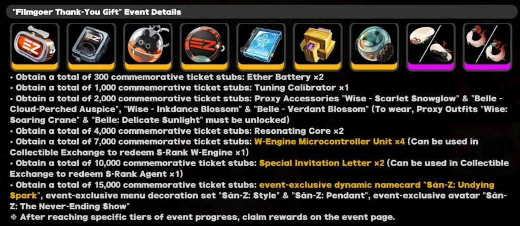 Accumulating specific amounts of commemorative ticket stubs will unlock the corresponding reward, including two free S-Rank Agents and W-Engines (choose between Qing Yi, Burnice, and Jane Doe). The other rewards are as follows: