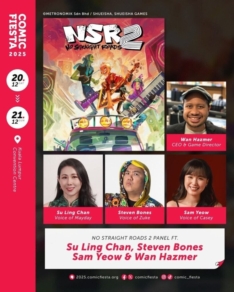 Not only that, Comic Fiesta attendees can get even closer to the action with a special conference at the Tea Stage on December 20th 14:30 -15:30 MYT. Featuring appearances from the voice actors behind NSR2’s beloved characters — Su Ling (Mayday), Steven Bones (Zuke), and Sam (Casey) — as well as a talk from Wan Hazmer (Game Director), fans can find out more about the eagerly anticipated sequel to No Straight Roads, before attending a meet and greet between 16:00-17:00 MYT at the Creative Factor Panel Room.