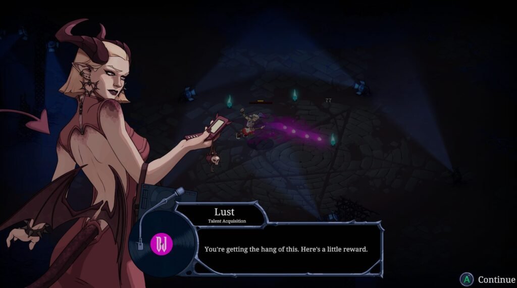 Between each run, you head back to the Devil’s HQ to check quest progress, purchase permanent upgrades and new attacks. This is where Devil Jam loses me a little. While you do receive a barebones introduction to the overarching plot, the game doesn’t do much in terms of teaching you its mechanics, explaining its store system, or even updating you on your quest progression.