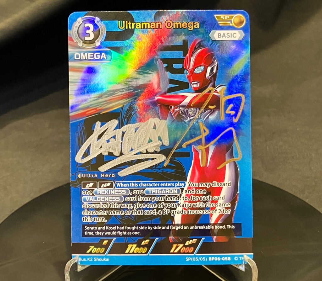 Among the most sought-after inclusions is a limited-edition Ultraman Omega (SP) card, autographed by Shori Kondo and Haruto Yoshida, who portray Sorato Okida and Kosei Hoshimi in the Ultraman Omega series. Limited to 100 copies worldwide, the card was unveiled following the series’ final episode, which aired on January 17. The artwork depicts Ultraman Omega executing his signature finishing move, the Reticulute Beam. The signed cards will be randomly inserted into booster packs.