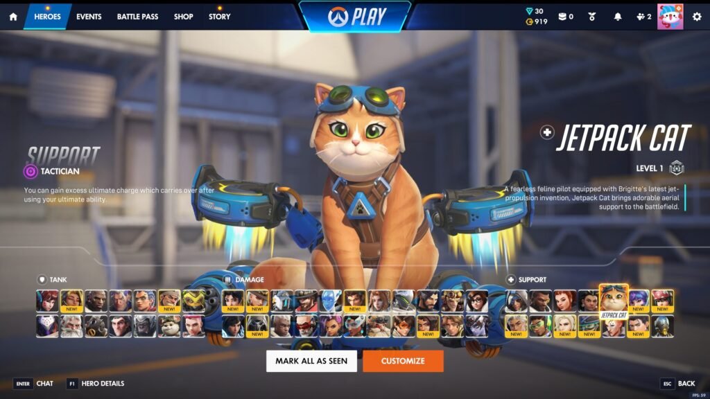 A stray cat mysteriously turned up at Watchpoint: Gibraltar, and resident feline fanatic Brigitte was eager to adopt her. Since her early days, Brigitte has been using her cats as workshop assistants, imagining them in outlandish situations. But when Talon attacked Gibraltar, those farfetched dreams became a possible saving grace. Brigitte constructed a jetpack that would allow the cat to fly into battle and lend a helping paw to any teammates in need.