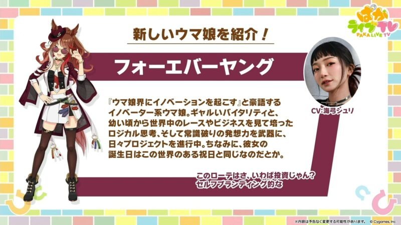 However, that’s not the only thing that makes her addition notable. The real-world Forever Young was not only born on the same day as Umamusume: Pretty Derby’s anniversary (February 24), but also happens to be owned by Susumu Fujita, the president of CyberAgent – a.k.a. the parent company of Umamusume developers Cygames.
