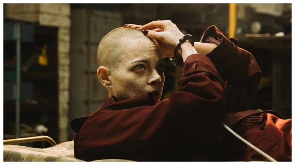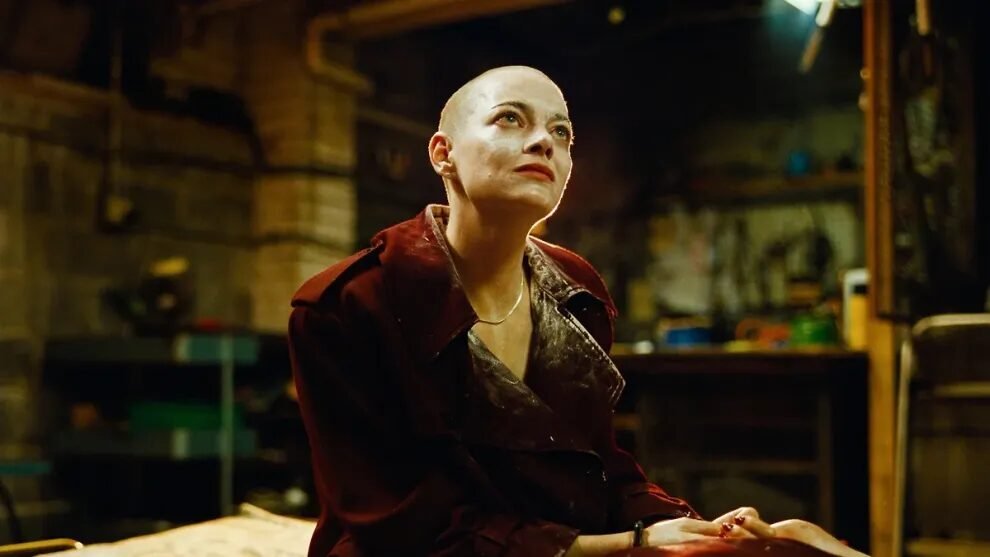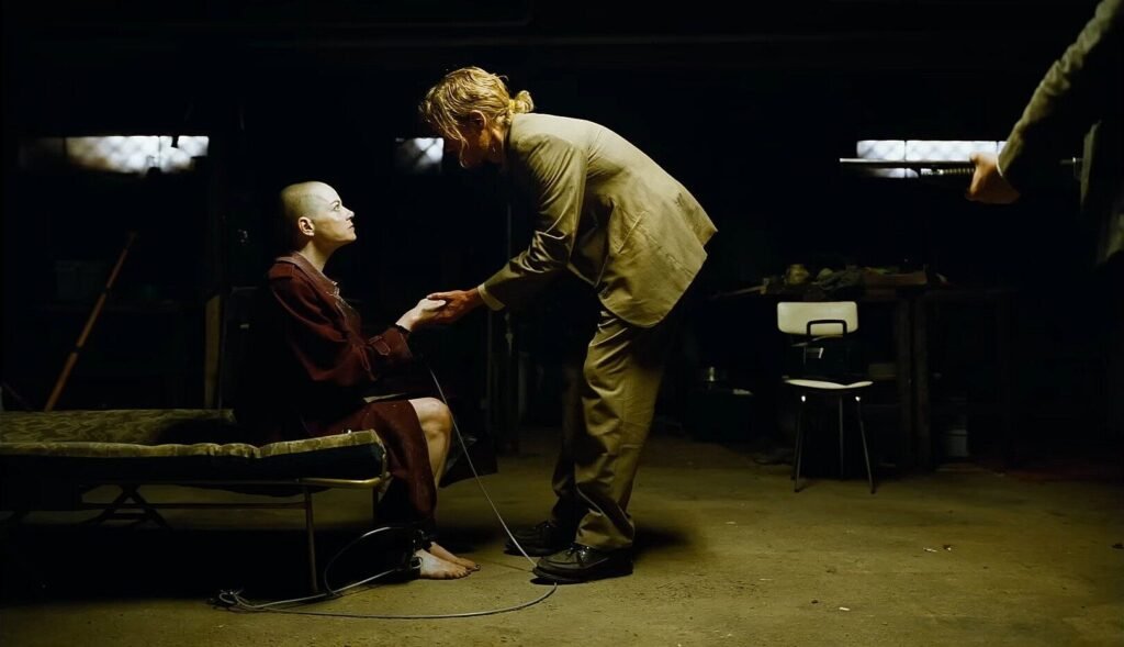 Lanthimos uses black-and-white flashbacks to represent Teddy’s darkest memories. These scenes are colorless and surreal, featuring massive needles and floating bodies, to symbolize his trauma and personal hell that distorted his view of reality. The film also uses a unique 1.5:1 aspect ratio and low-angle camera work to give the characters a towering, Shakespearean presence, even in the cramped basement. It’s a signature of Lanthimos’ filmmaking style with a theatre background that enhances the narrative and expression of the characters’ dynamics and hierarchy.