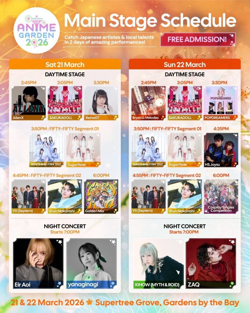 Anime Garden 2026 returns to Gardens by the Bay this 21 and 22 March 2026, happening at the iconic Supertree Grove and Flower Dome. The free weekend festival celebrates Japanese music, cosplay and pop culture, bringing together regional artistes, celebrity cosplayers and fans for two days of performances, activities and community gatherings.