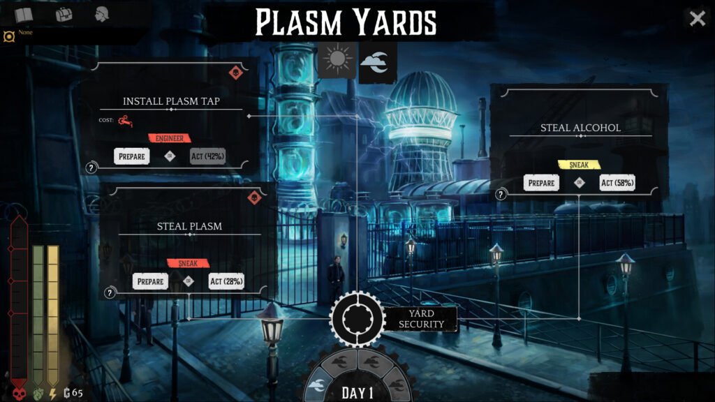 The dice mechanics in Duskpunk are cruel but fair. You’re not going to win rolls on a stat you have 0 points in, but you’re going to have decent-to-good odds on a stat with 3 points or higher. For instance, with the Criminal background, I had little to no points in Engineer or Skirmish. That made it difficult for me to work in the factory or participate in brawls without constantly praying for a high roll. But I was good at other things. I could pickpocket using my high Sneak skill, or gather information in the night with my high Intuit skill.