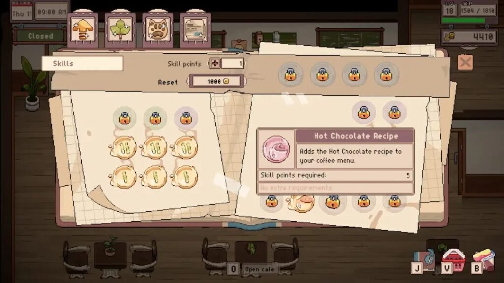 • The Skill Tree: You can invest points into efficiency (faster brewing) or quality-of-life perks (like the ability to automate the latte art minigame).