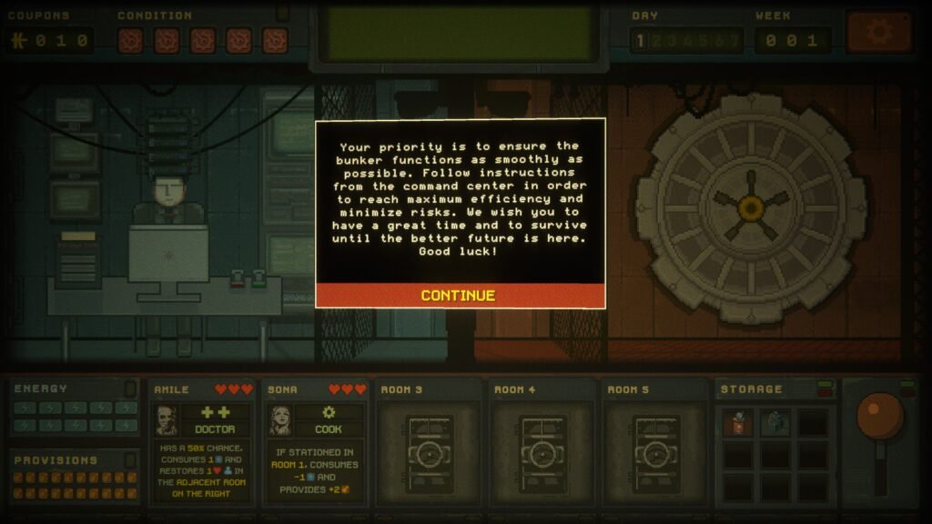 On the other hand, the games music has an 8-bit lofi vibe to it, which is relaxing yet gives a sense of melancholy which really adds to the atmosphere. The sound design also has this clunkiness whenever you interact with items or the UI, which further sells the bunker vibes.